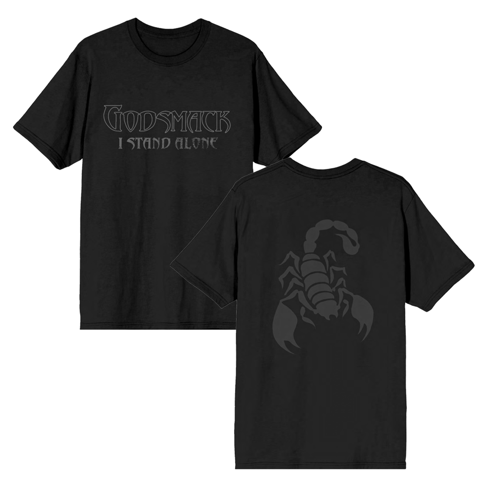 The I Stand Alone Logo Scorpion tee features the Godsmack logo along and title of the iconic Faceless track on front with scorpion printed on back.
